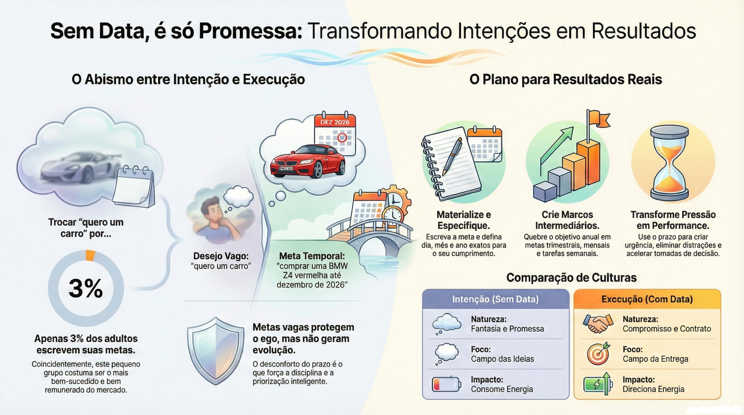 Quando existe uma data específica, o cérebro prioriza, organiza recursos e reduz distrações. Sem data, tudo pode ser adiado.